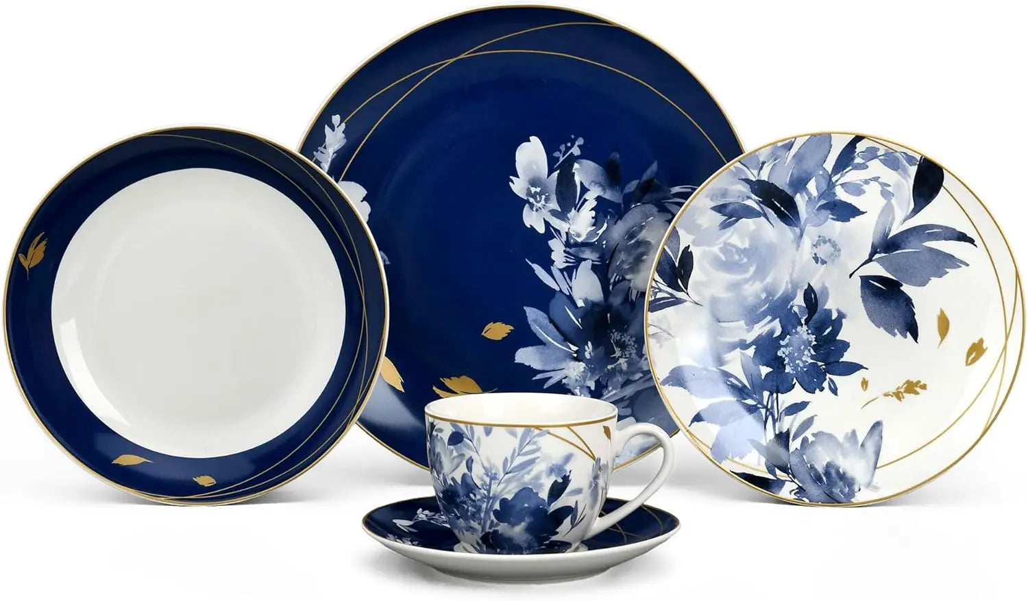 - 20-piece set for four — includes 4 dinner plates, 4 deep plates, 4 dessert plates, 4 cups, and 4 saucers.