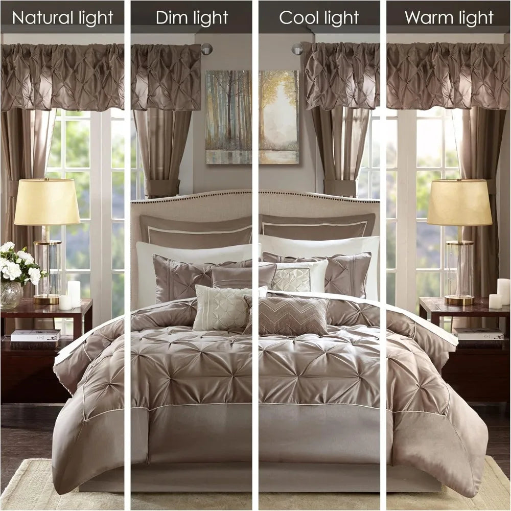 Experience luxury and cohesive style with the Madison Park Essentials Luxe Diamond Tufting Faux Silk Comforter Set With Matching Curtains And Decorative Accessories. This complete 24-piece bedroom ensemble is crafted from 100% polyester, delivering a plush, hotel-inspired texture in a sophisticated taupe tone. The faux silk comforter showcases diamond tufting and a refined border frame for an elevated, tactile finish. Designed for easy care, the full set is machine washable and built to retain its beauty wash after wash.