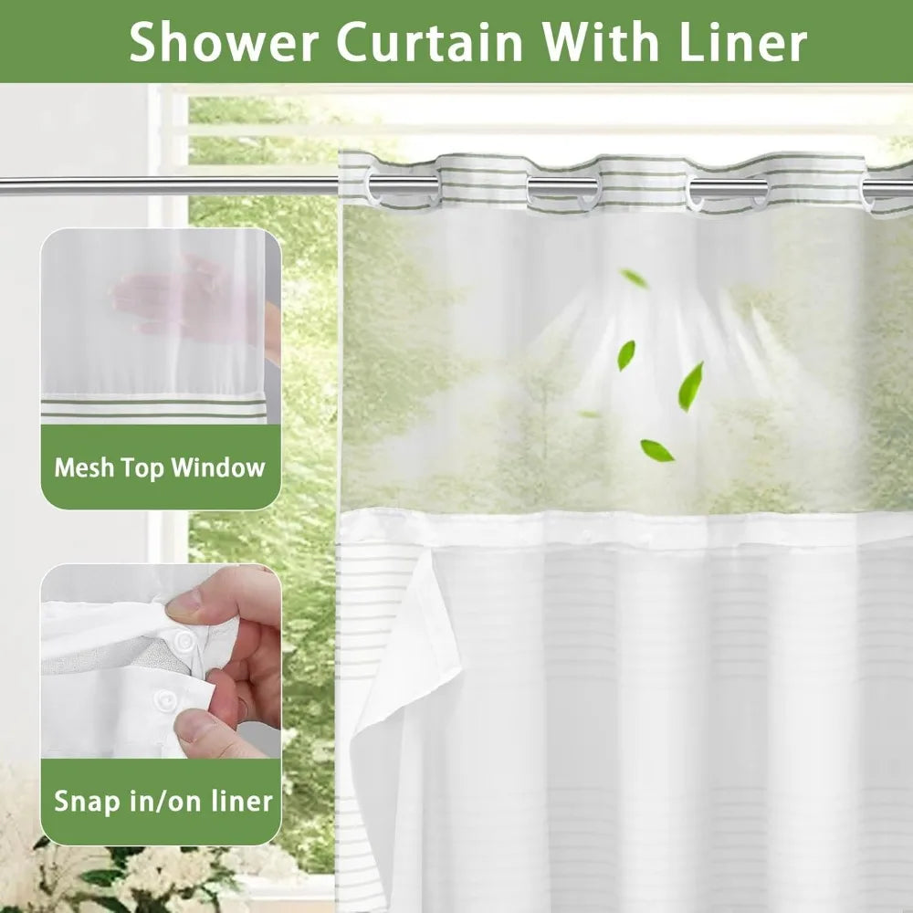 Designed for bathroom spaces of all sizes, this shower curtain brings together practicality and style with a premium cotton-linen blend, a satin-like finish, and a serene sage green color. The snap-in liner system provides reliable waterproof protection, while the sheer viewing window offers light and airflow without compromising privacy. Upgrade your shower routine with a curtain that’s easy to install, easy to maintain, and built to last.